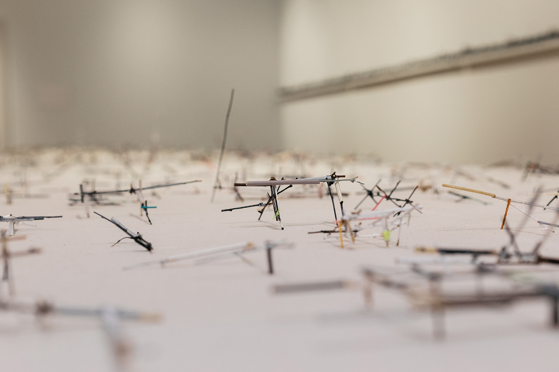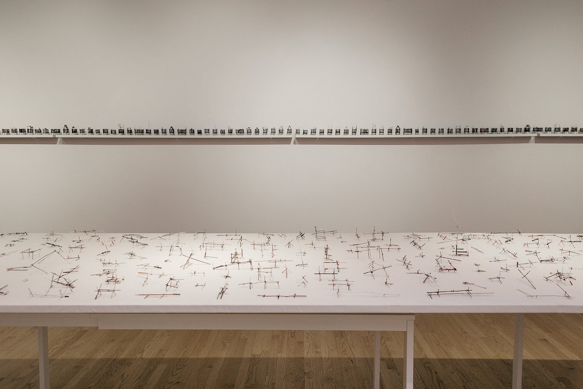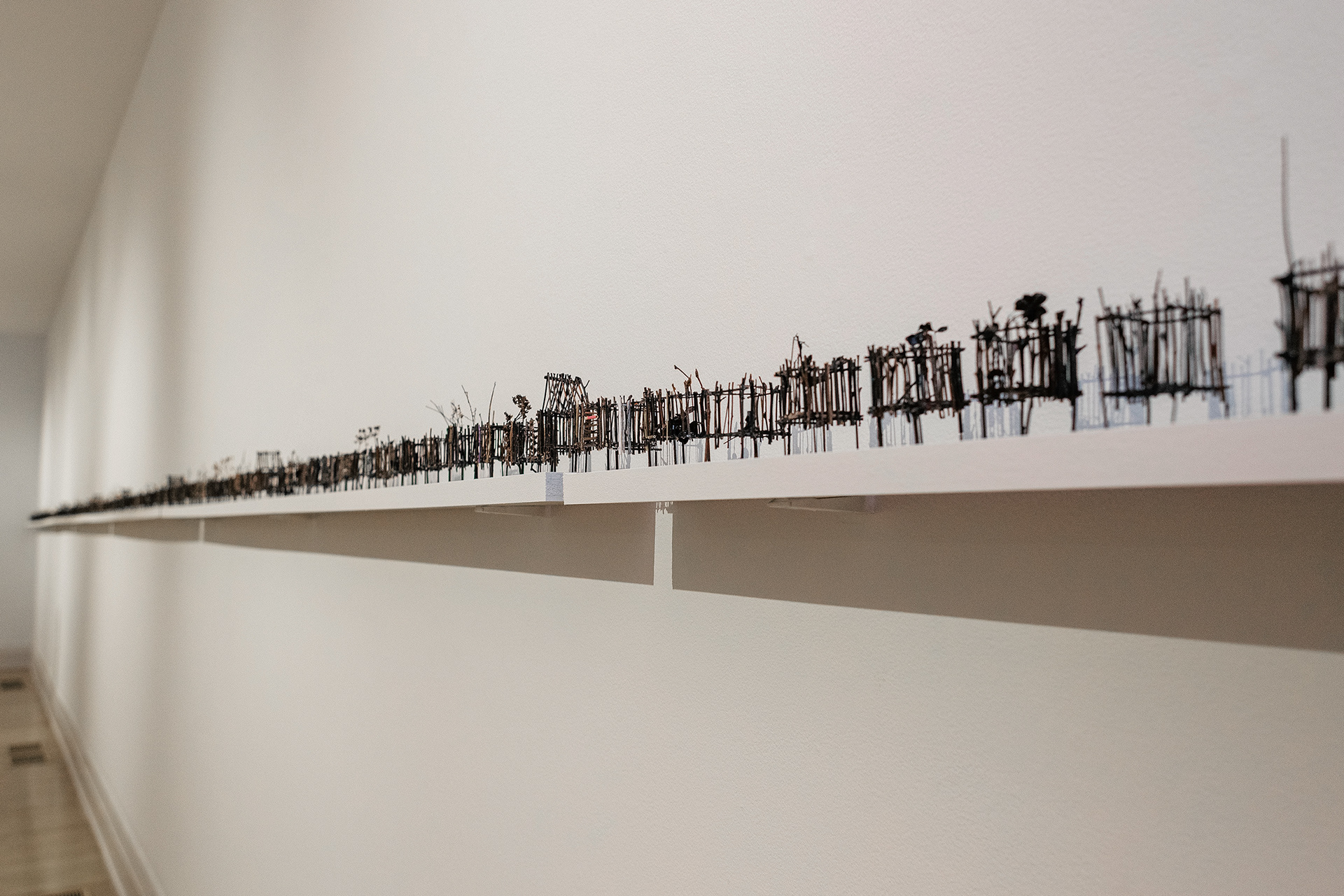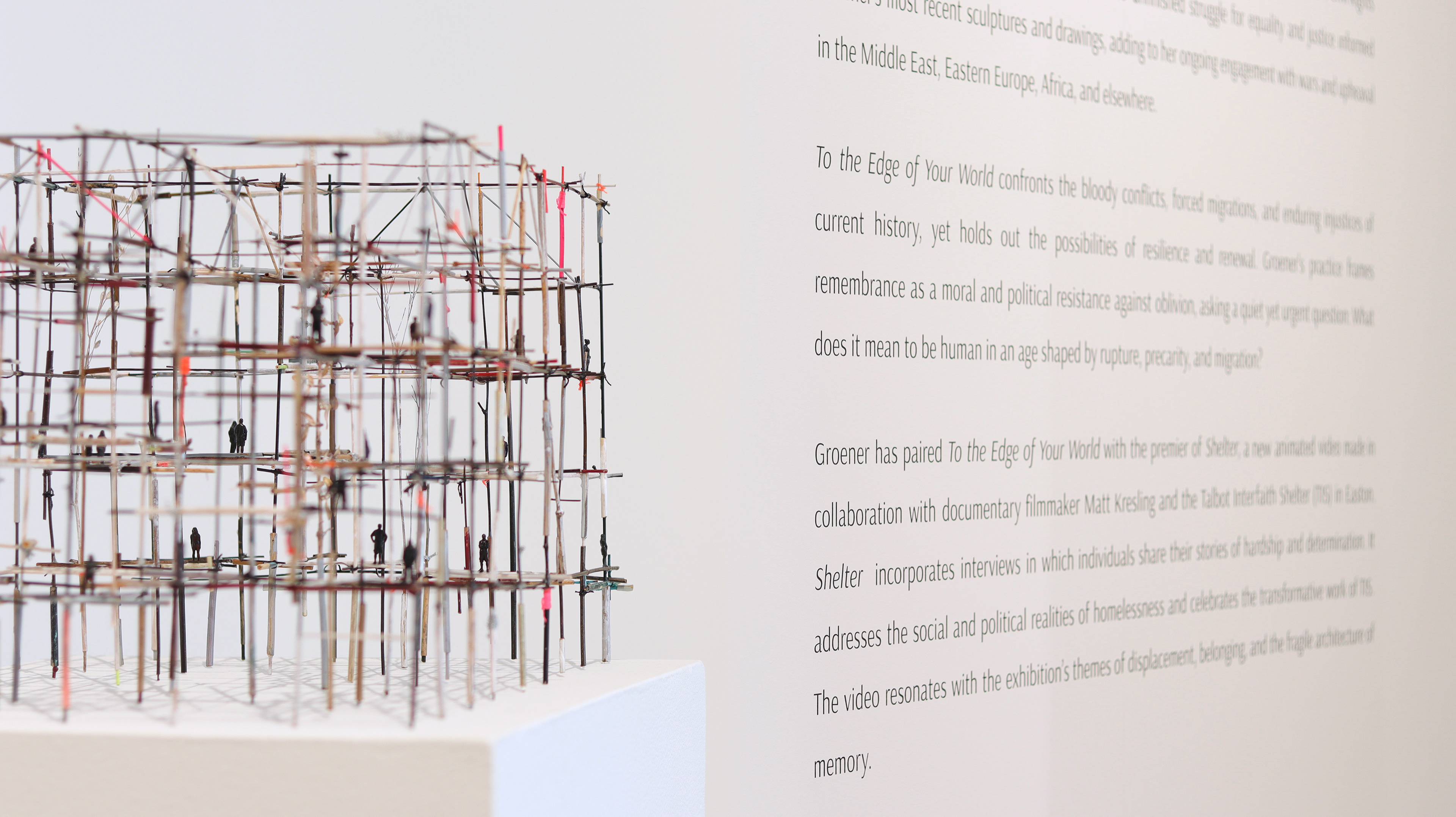 This exhibition contemplates loss, displacement, exile, and war, confronting the bloody conflicts, forced migrations, and enduring injustices of current history, yet holds out the possibilities of resilience and renewal. Using humble and ephemeral materials—including twigs, twine, cardboard, and cut paper—that speak of vulnerability, the Irish artist’s sculptural installations consider the interconnectedness of individual and universal experience. A 2022 road trip across the South, visiting sites important to the Civil Rights Movement and America’s unfinished struggle for equality and justice, informed Groener’s most recent sculpture and drawings, adding to her ongoing engagement with the world’s past decade of war and upheaval in the Middle East, Eastern Europe, Africa, and elsewhere.