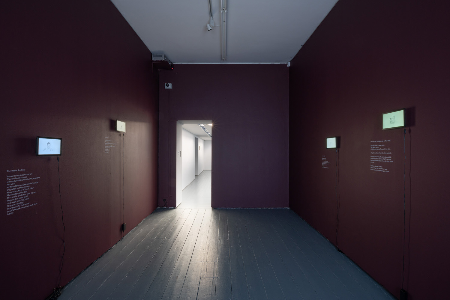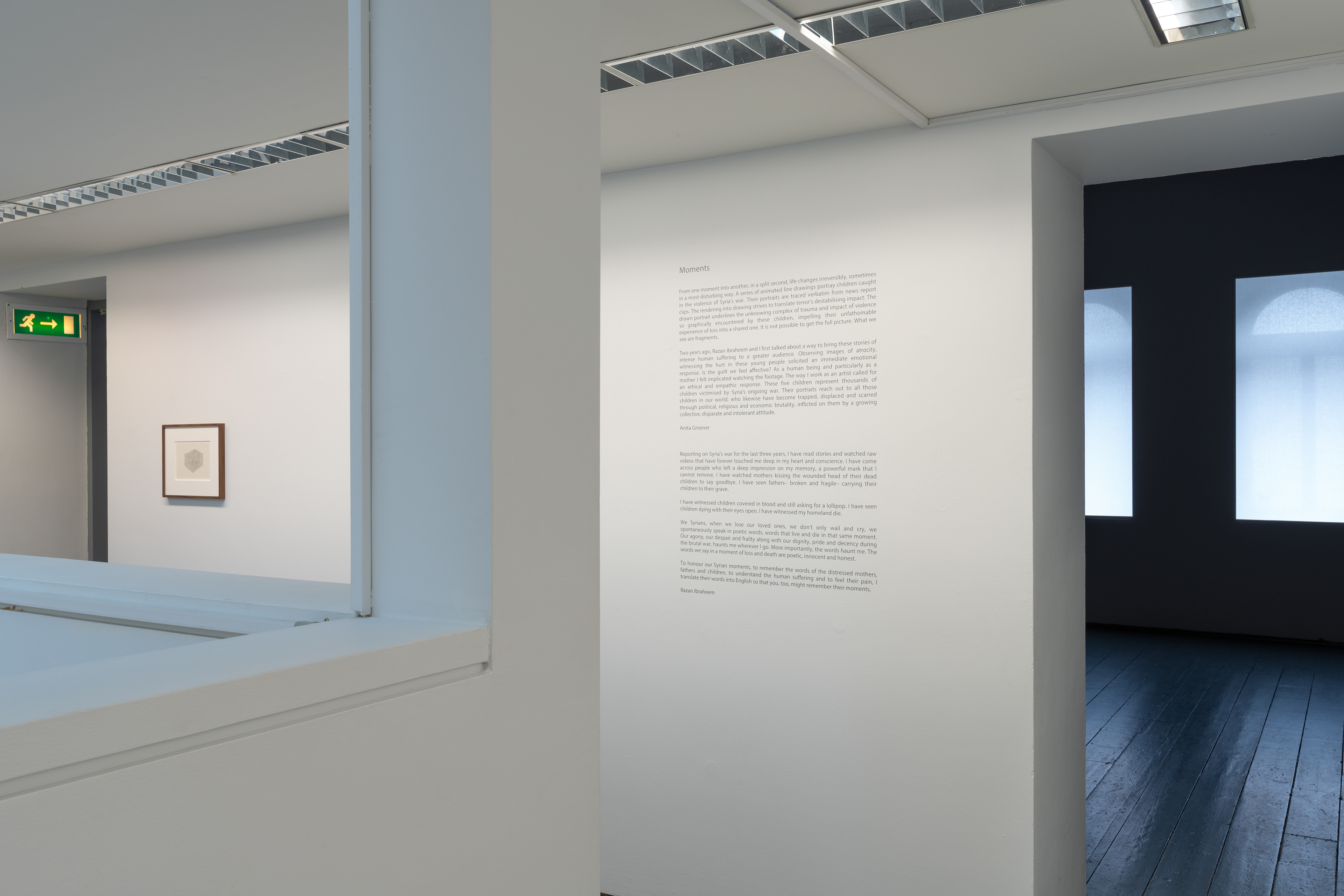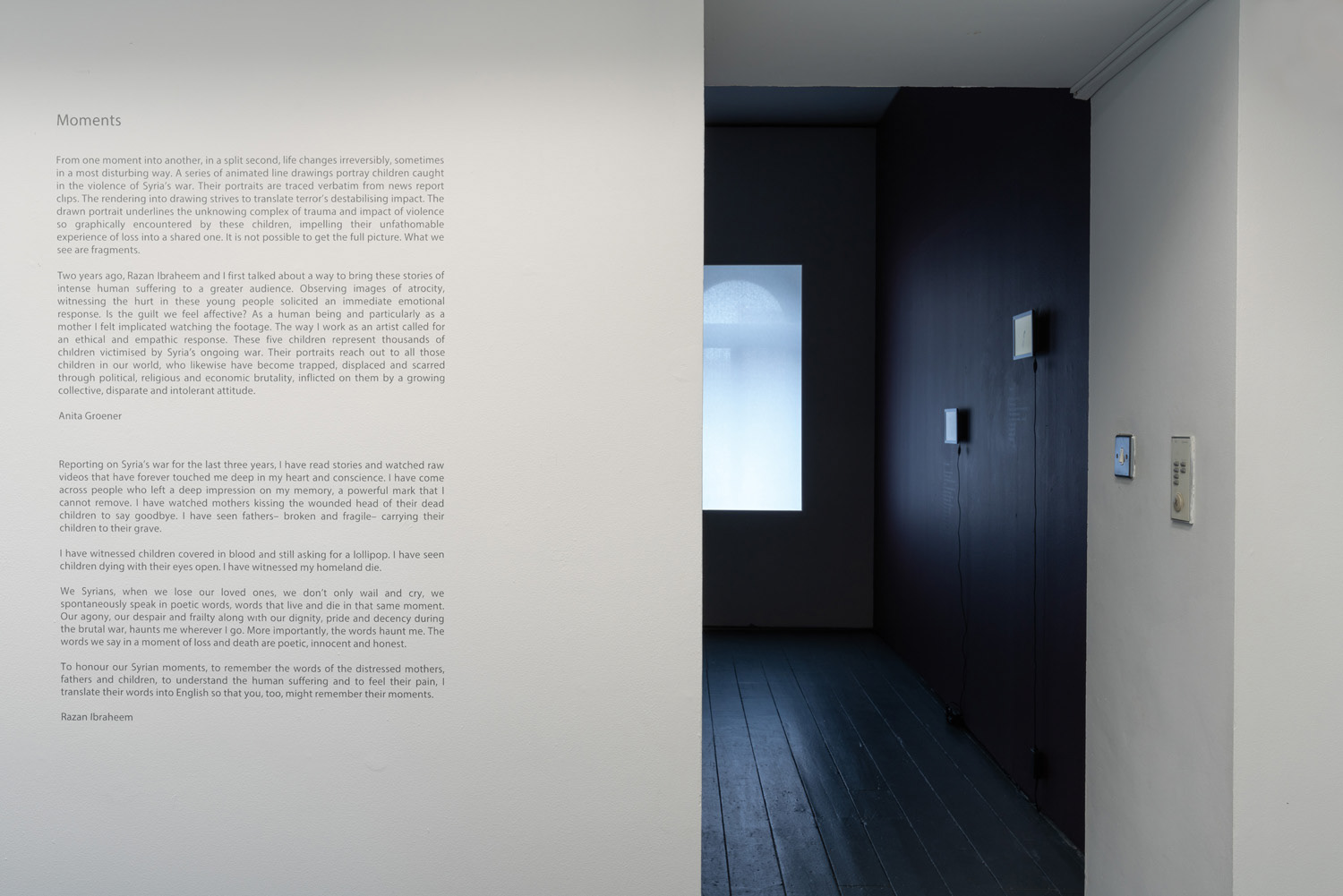 In the mezzanine gallery space, a series of drawing animations, Moments, is based on the testimonies of five children or those close to them, who became victims of Syria's war. The drawings are five miniature portraits. Groener collaborated with journalist Razan Ibraheem, who reported on the war and gathered the testimonies. The words, which are quietly devastating, are written onto the gallery walls by children at a local inner-city school. As Ibraheem writes: "I have watched mothers kissing the wounded head of their dead children to say goodbye ... I have witnessed children covered in blood and still asking for a lollipop.."
