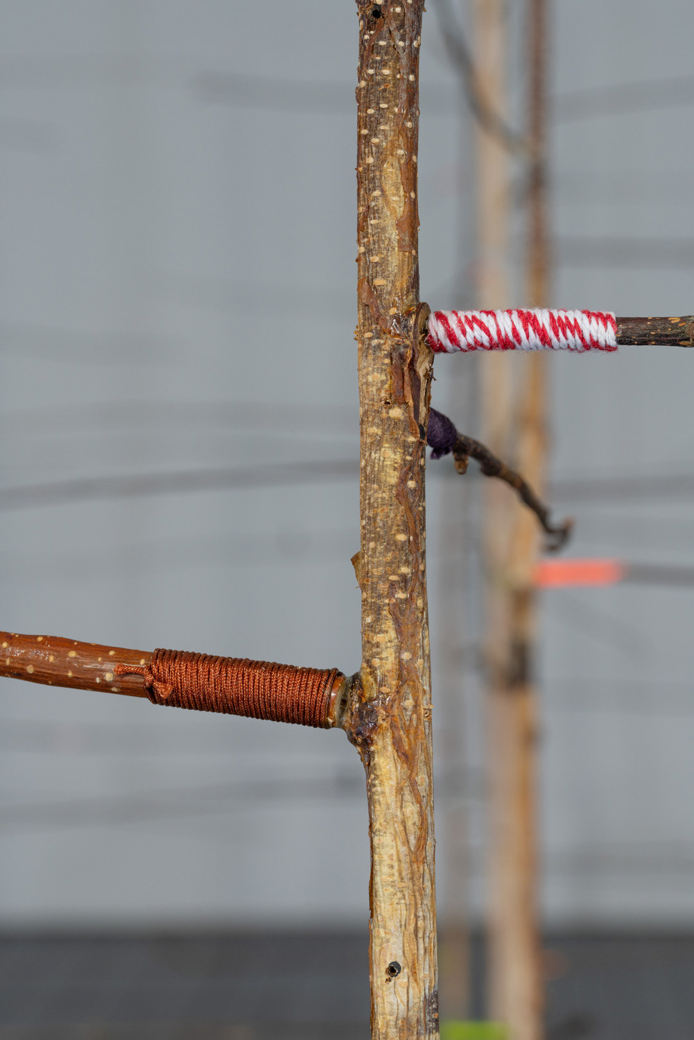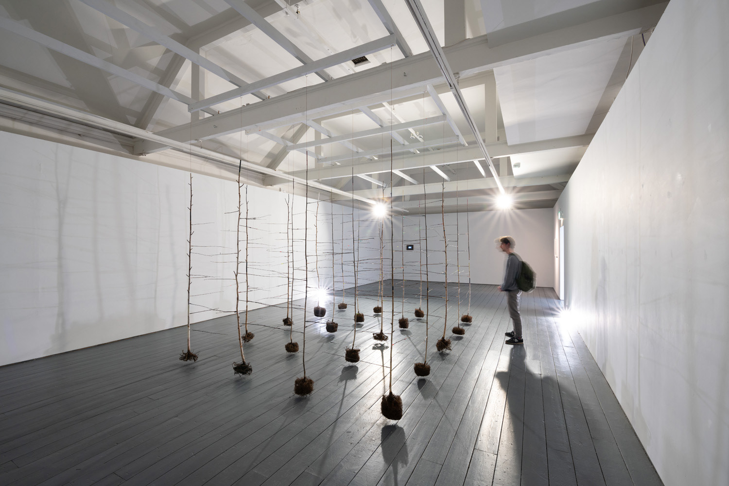The Past is a Foreign Country hinges on an act of symbolic cruelty that helps to drive home its point and conveys something of the vehemence of feeling bound up in Anita Groener's approach to her subject matter. In The Lab's main gallery space, 20 spindly birch stems, arranged in a grid pattern, are suspended from above. They have been shorn of their branches, which have been reconfigured into lines of tenuous linkage between them. Their vestigial root balls hover uselessly above the floor.