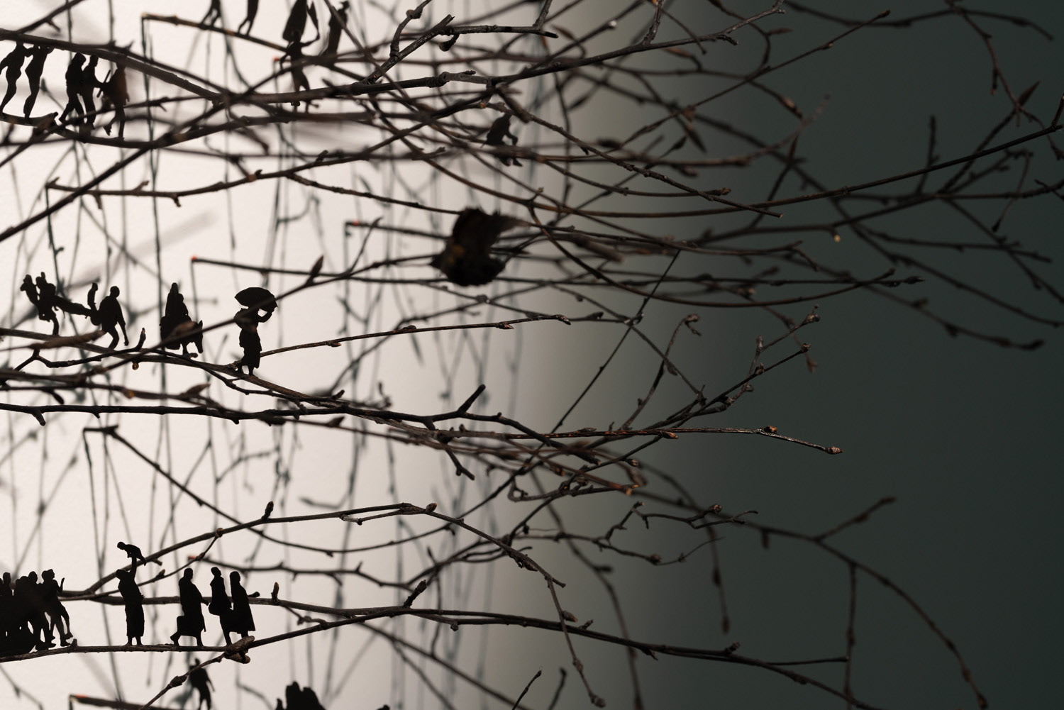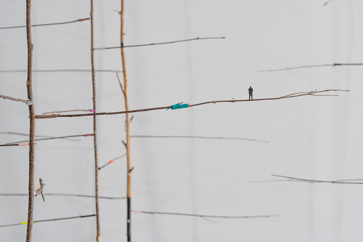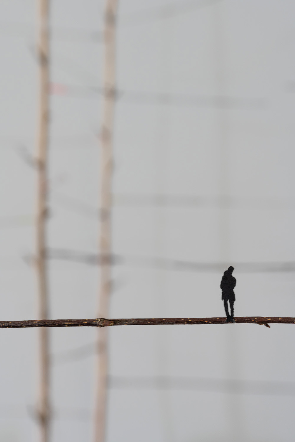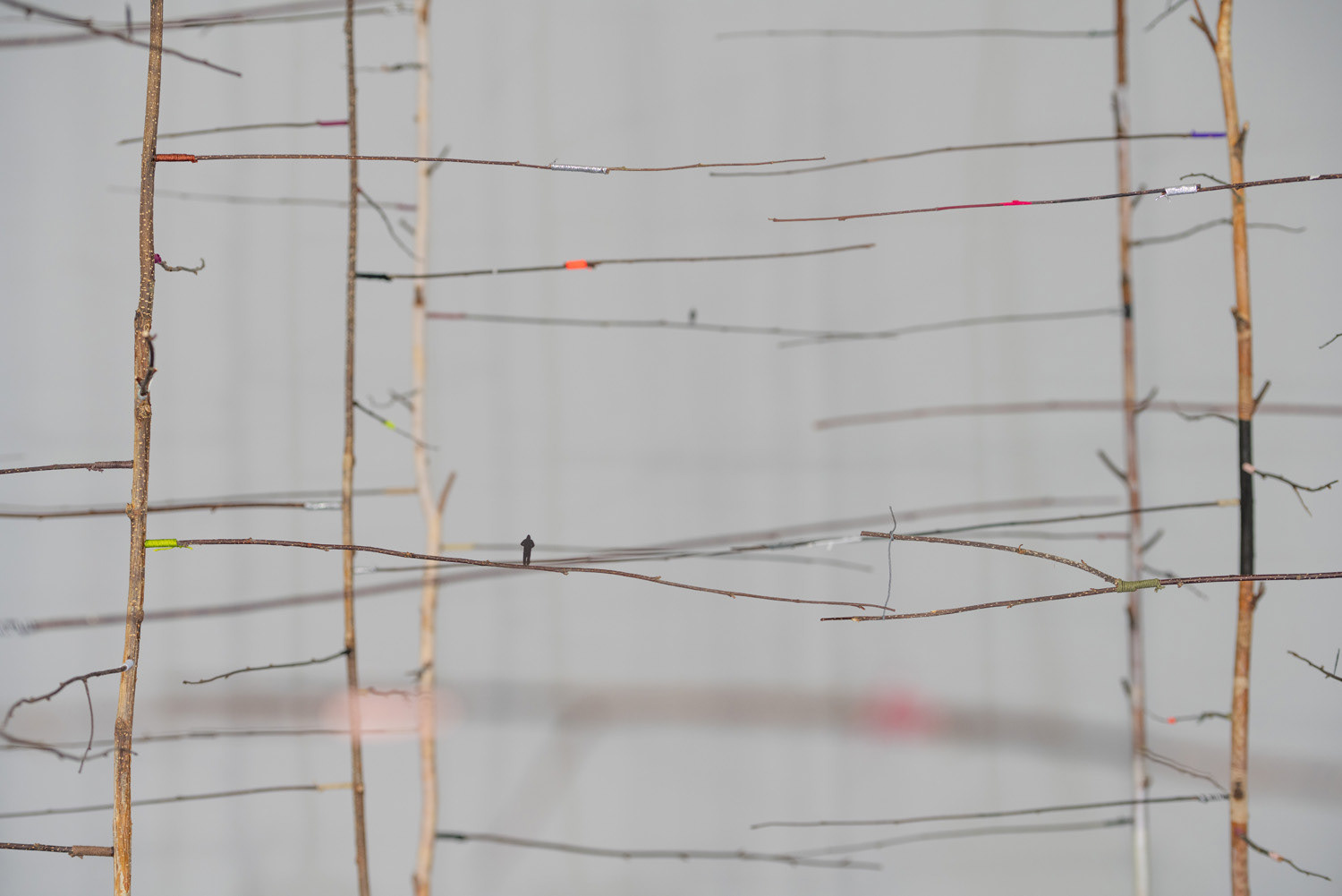 The Past is a Foreign Country (2018), 20 birch trees, twine, paper, paint, 400x300x300cm