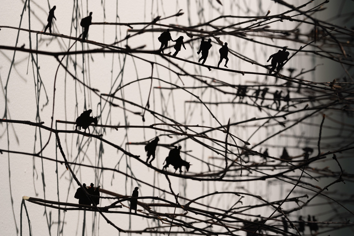 Groener drew her title from LP Hartley's 1950s novel The Go Between, in which the title character recalls his uncomprehending role in a series of tragic events during his childhood at the beginning of the 2oth century. The installation, which began a tour of several venues at the Limerick City Gallery last year (and will conclude its tour at Uilinn in Skibbereen later in the year), is a response to the experience of war, forced migration, refugee camps, unremitting loss and suffering on the part of so many people, children and adults, mostly displaced by the war in Syria. Groener's thwarted, uprooted birches with their delicate, peeling bark, grotesquely set adrift, form a brutally effective symbol of human tragedy.