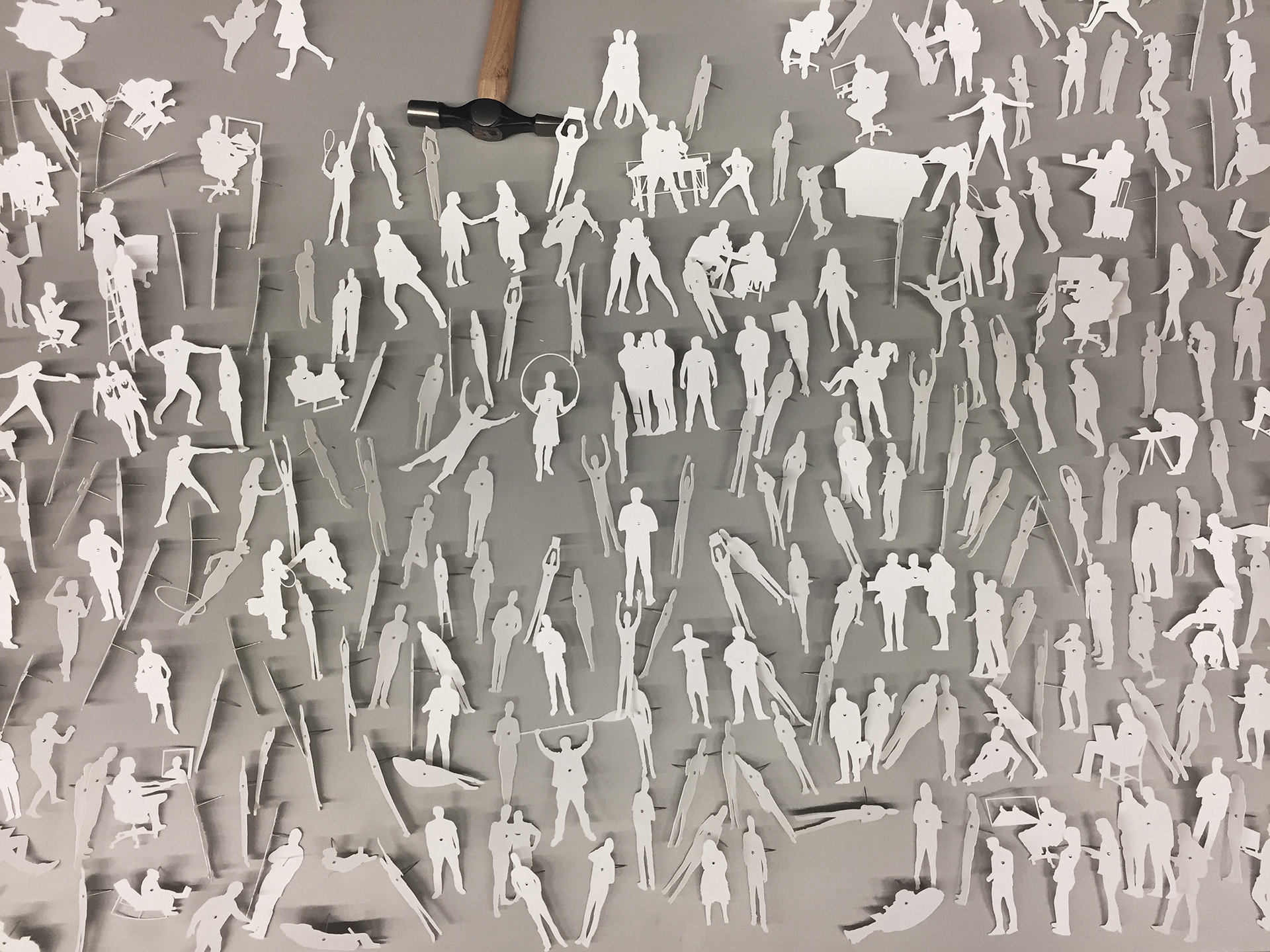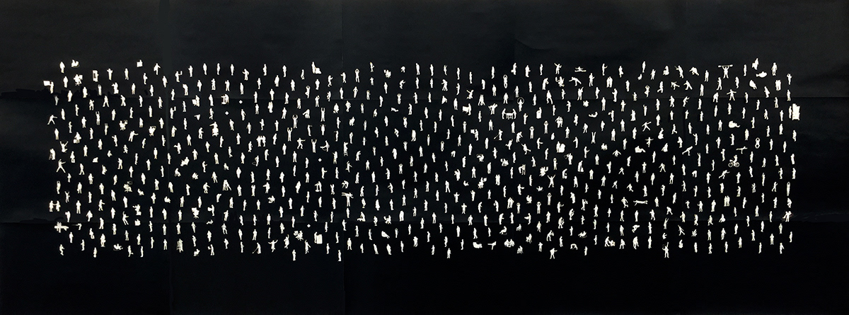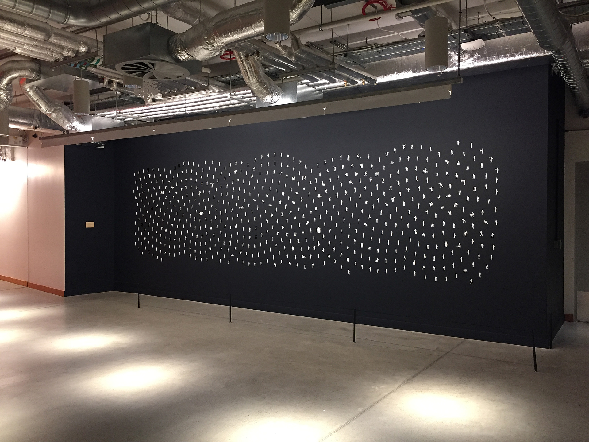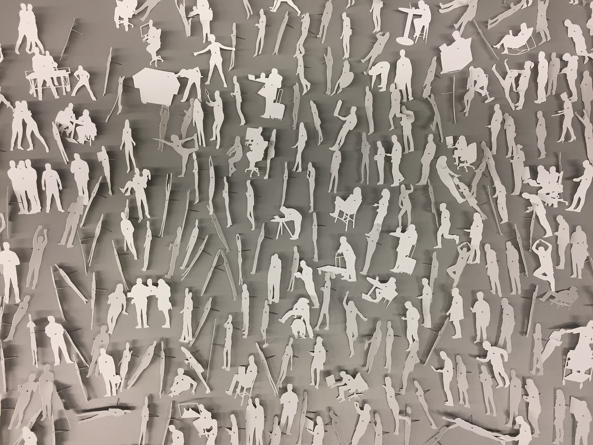 Inside Out came out of an artist residency at Facebook EMEA Headquarters in Dublin, Ireland. I had been on but never been inside FB and after the initial weeks of looking, watching, listening, talking, eating and walking around, I discovered a new community I thought of as Planet FB as I had never seen a work culture like it. I focused on how Facebook folk, as people representing 52 nationalities at the time in 2015, work, behave, move, interact and go about their business in an unexpected way, as individuals, within teams, in conference calls. I photographed around one thousand employees, each moving about in their own idiosyncratic way, or as part of their team. Translated into silhouette form, cut from mineral paper and grouped into a dynamic pattern, the work reflects an anthropological view on how systems, networks, and communities come about through human interaction.