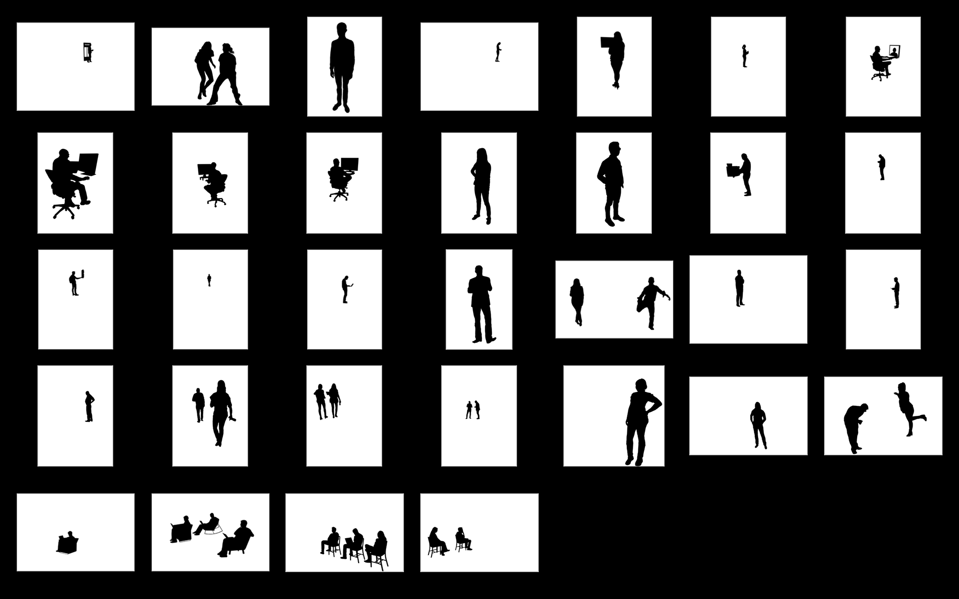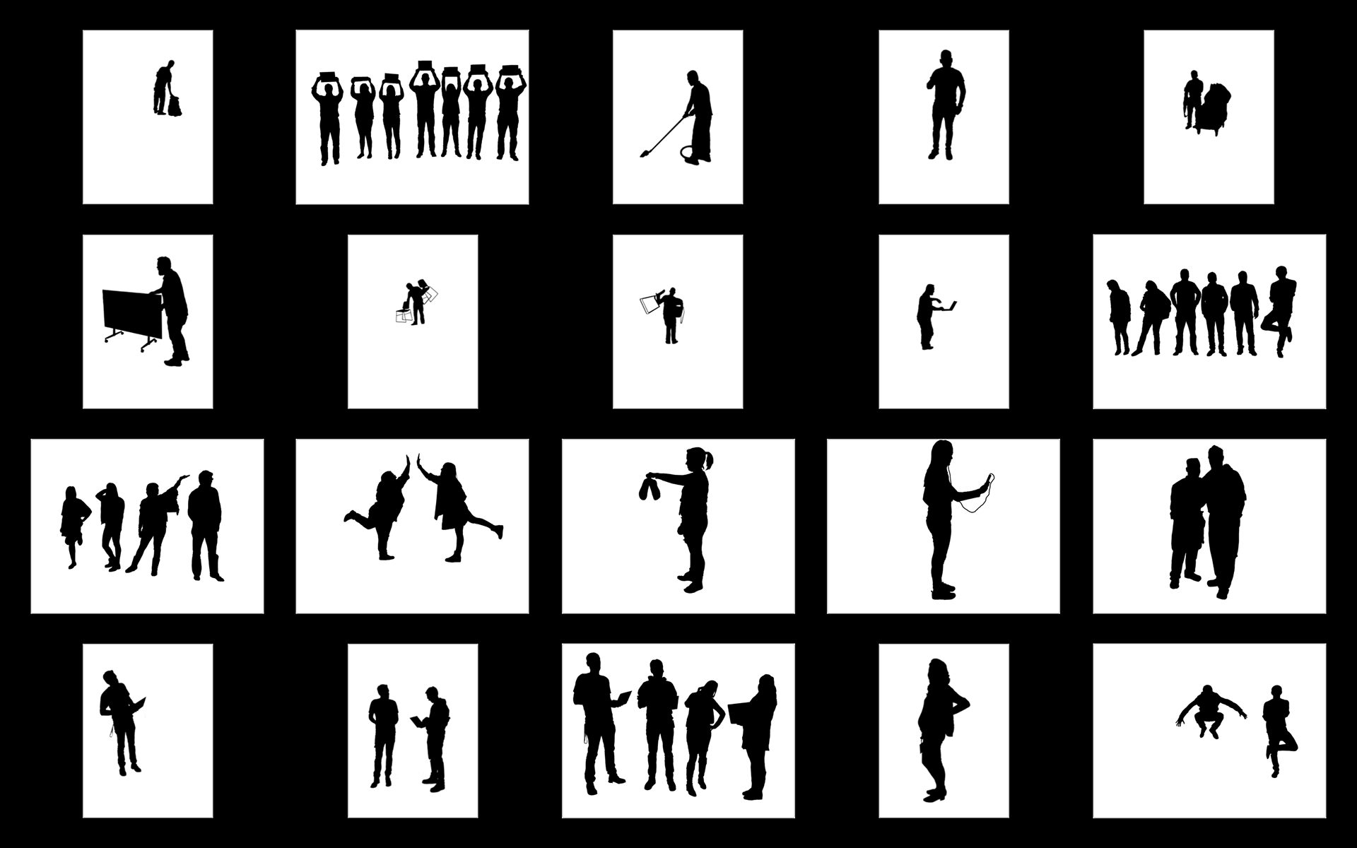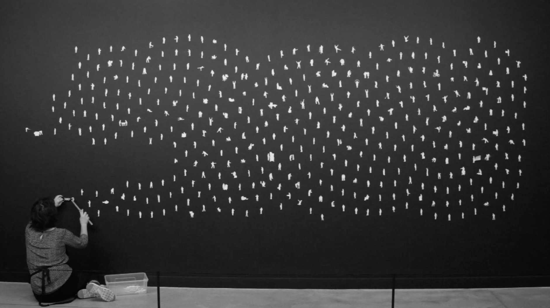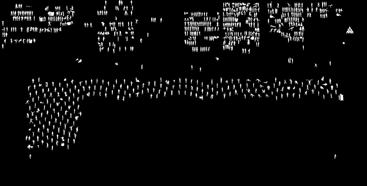 Inside Out came out of an artist residency at Facebook EMEA Headquarters in Dublin, Ireland. I had been on but never been inside FB and after the initial weeks of looking, watching, listening, talking, eating and walking around, I discovered a new community I thought of as Planet FB as I had never seen a work culture like it. I focused on how Facebook folk, as people representing 52 nationalities at the time in 2015, work, behave, move, interact and go about their business in an unexpected way, as individuals, within teams, in conference calls. I photographed around one thousand employees, each moving about in their own idiosyncratic way, or as part of their team. Translated into silhouette form, cut from mineral paper and grouped into a dynamic pattern, the work reflects an anthropological view on how systems, networks, and communities come about through human interaction.