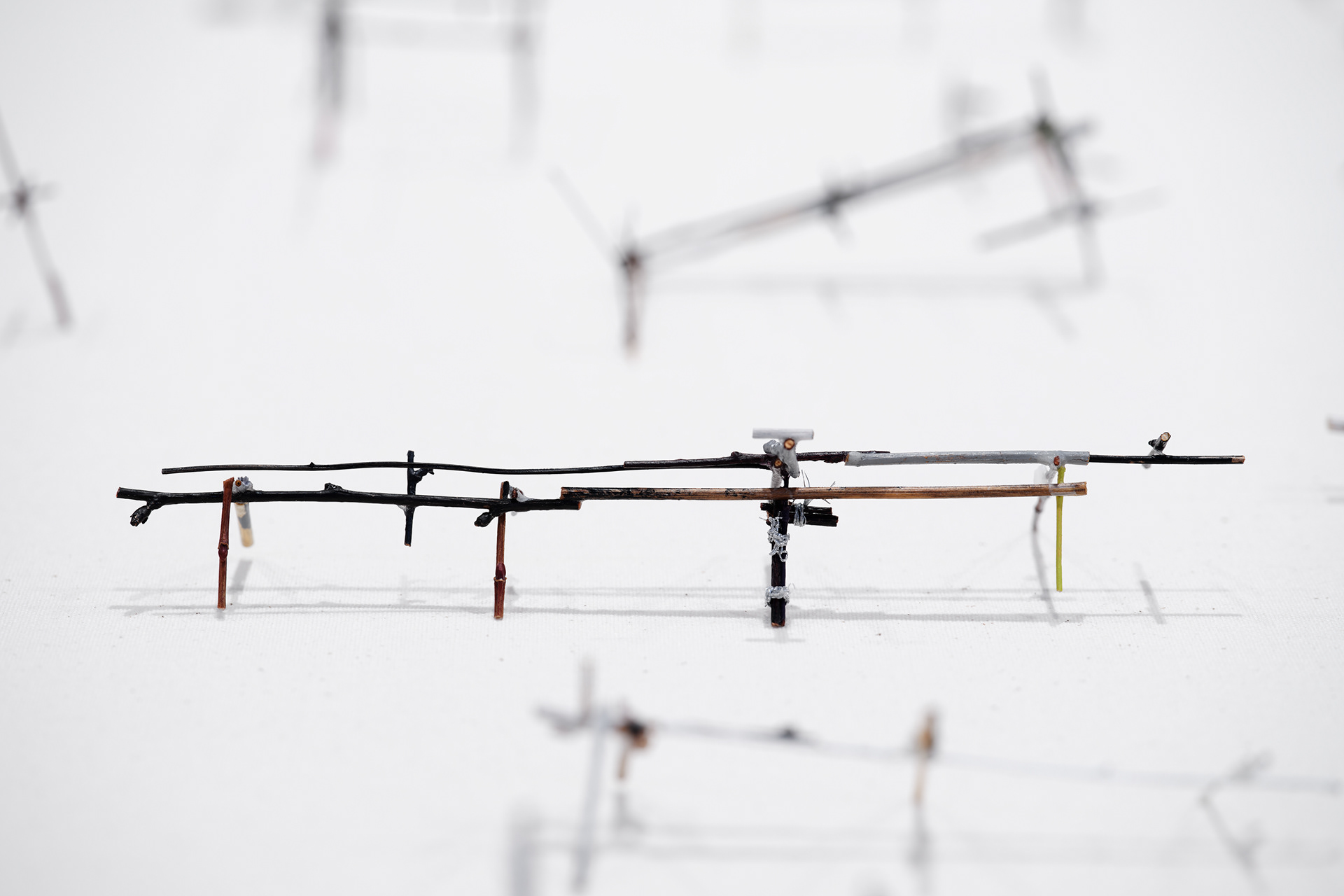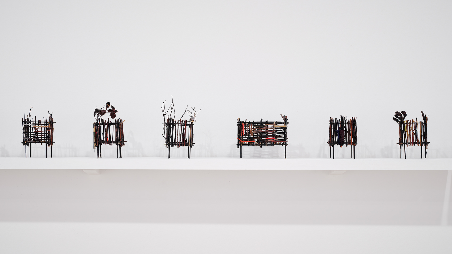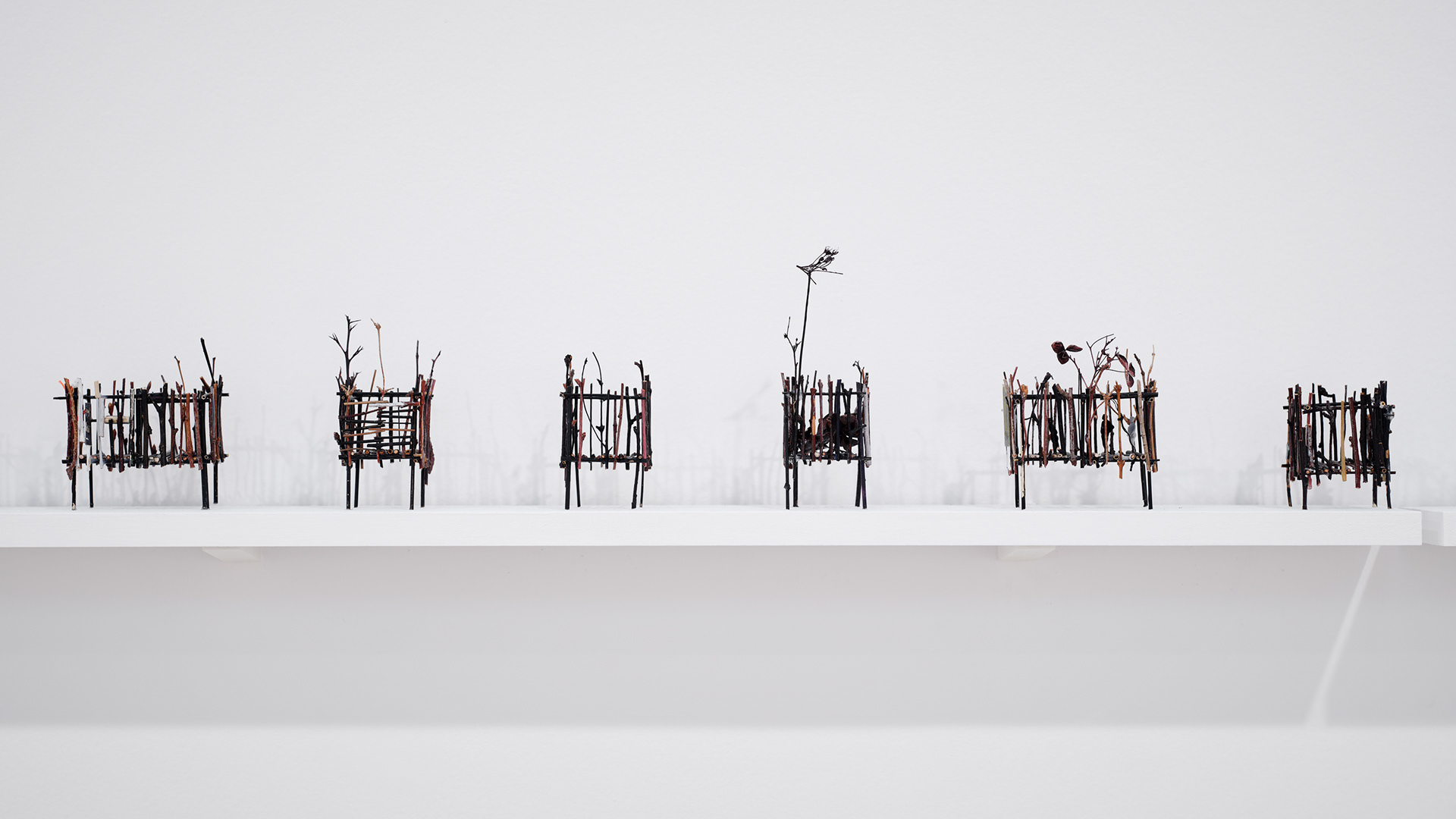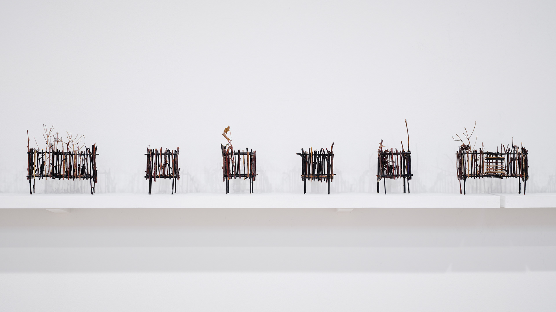 To the Edge of Your World asks what it means to be human today. The works in the installation painstakingly transform discarded materials such as twigs, twine, and cardboard into delicate sculptural metaphors for the interconnectedness of individual experience and world events. Broken and discarded bits of trees and twigs have been cut from their support system. In Groener’s work, Twine embodies an innate desire to physically, emotionally, and metaphorically repair and bridge distances. Repetition serves to revisit something already done or said relentlessly. Suffused by an audio environment of song combined with fragments of sounds from nature and everyday street life, the exhibition evokes patterns of displacement and the fragility of existence, as well as probing both the psychological effects of human tragedy and the resilience that may result. “It is a questioning of perception and a longing to get closer to an understanding of human conscience,” says the artist.
