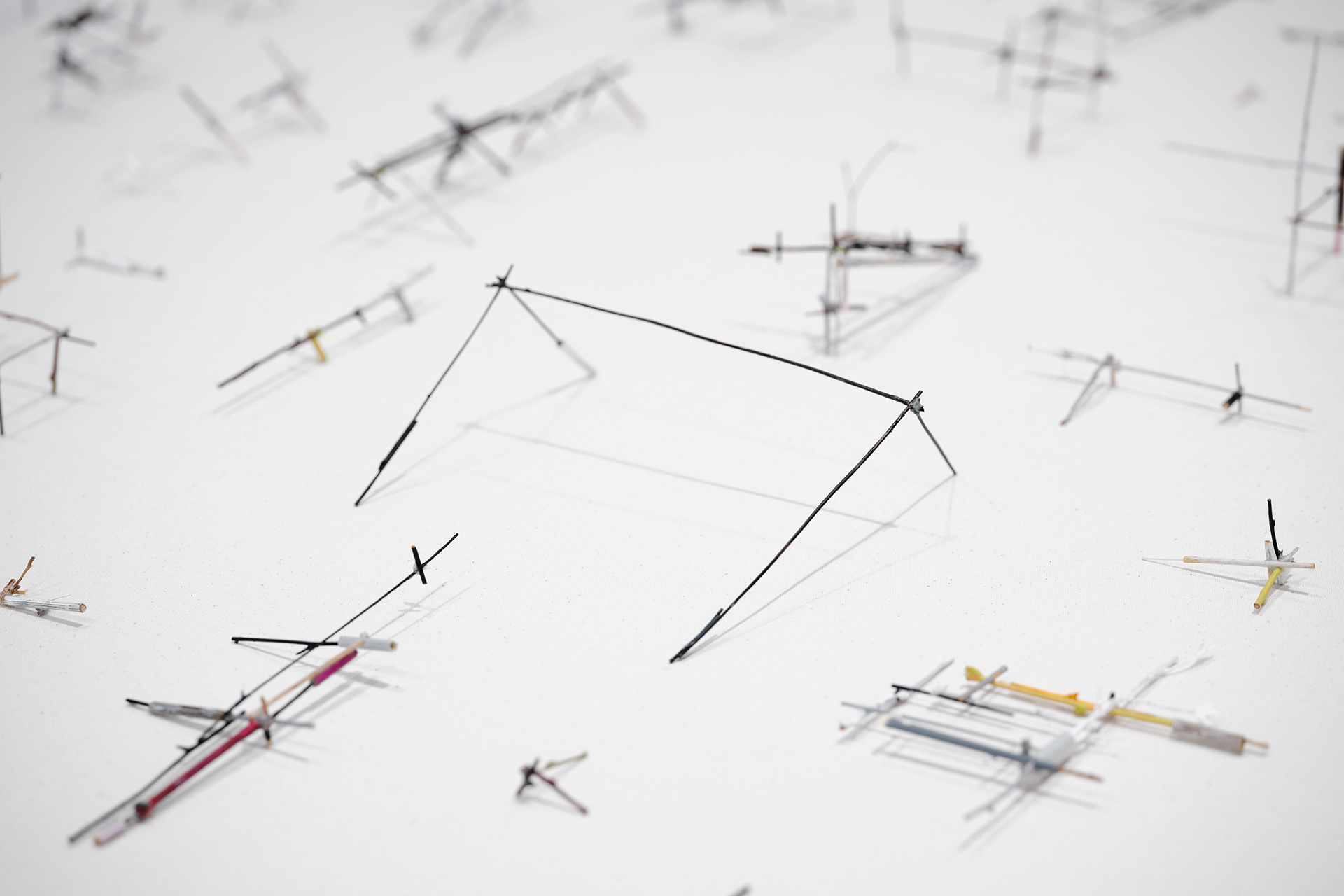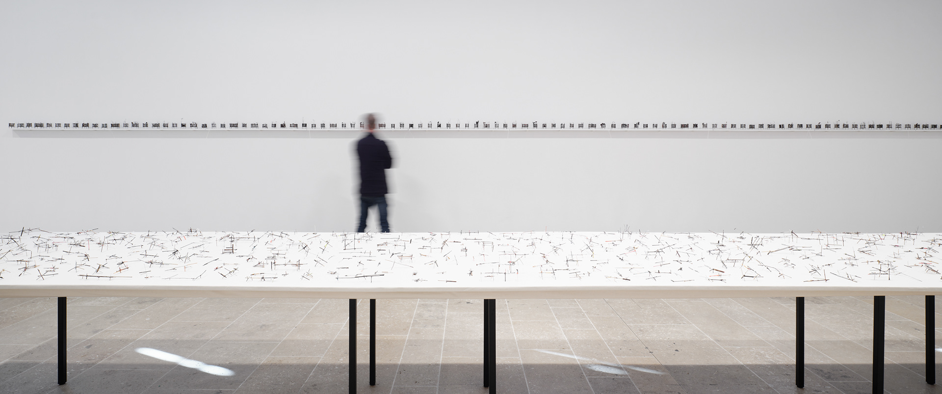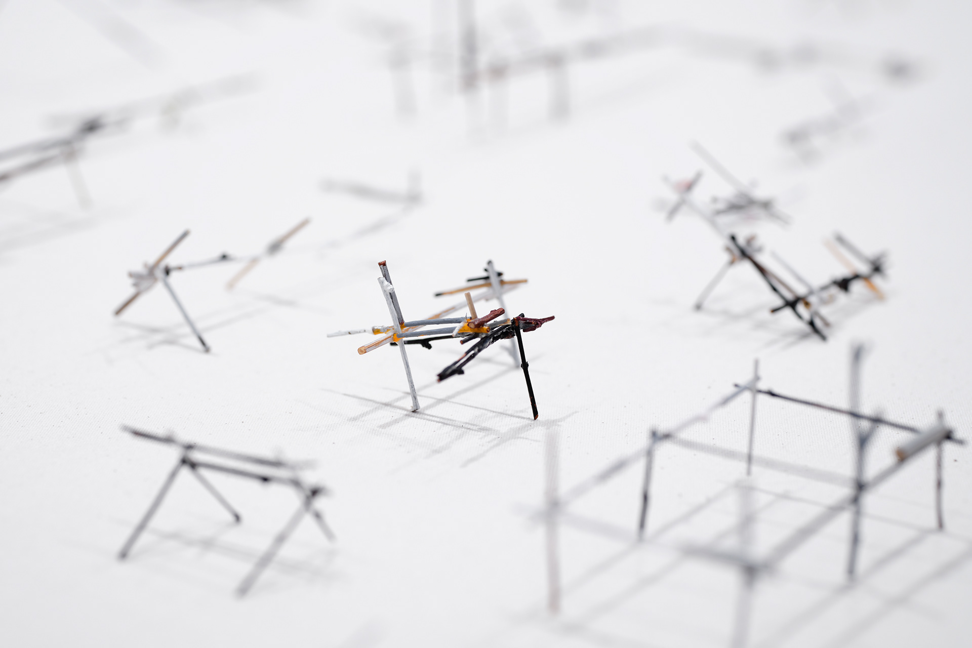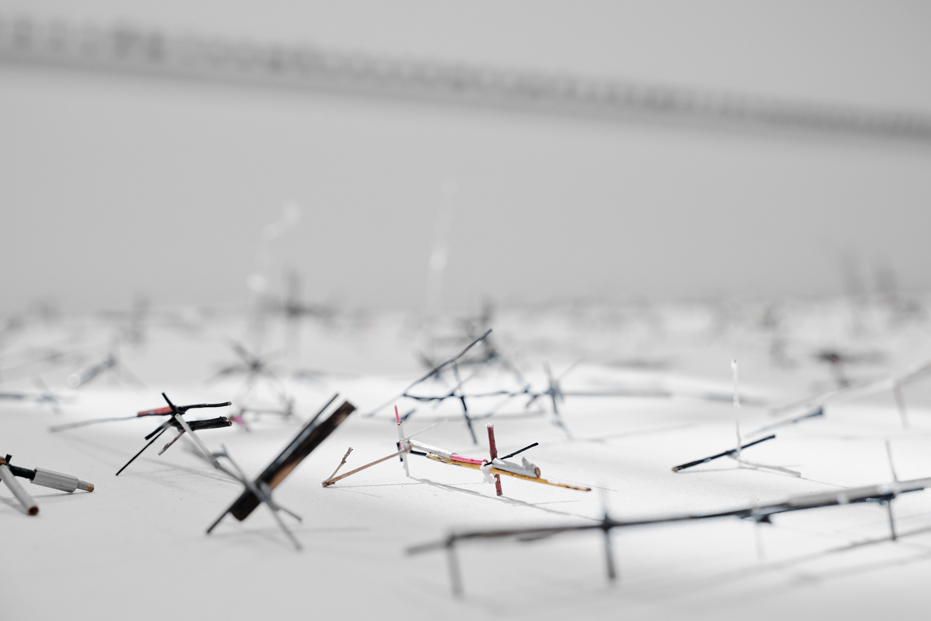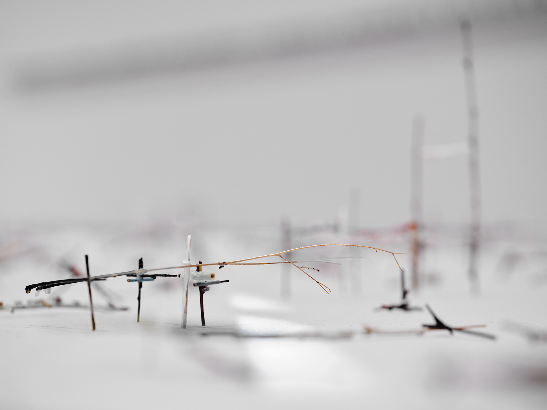 To the Edge of Your World asks what it means to be human today. The works in the installation painstakingly transform discarded materials such as twigs, twine, and cardboard into delicate sculptural metaphors for the interconnectedness of individual experience and world events. Broken and discarded bits of trees and twigs have been cut from their support system. In Groener’s work, Twine embodies an innate desire to physically, emotionally, and metaphorically repair and bridge distances. Repetition serves to revisit something already done or said relentlessly. Suffused by an audio environment of song combined with fragments of sounds from nature and everyday street life, the exhibition evokes patterns of displacement and the fragility of existence, as well as probing both the psychological effects of human tragedy and the resilience that may result. “It is a questioning of perception and a longing to get closer to an understanding of human conscience,” says the artist.