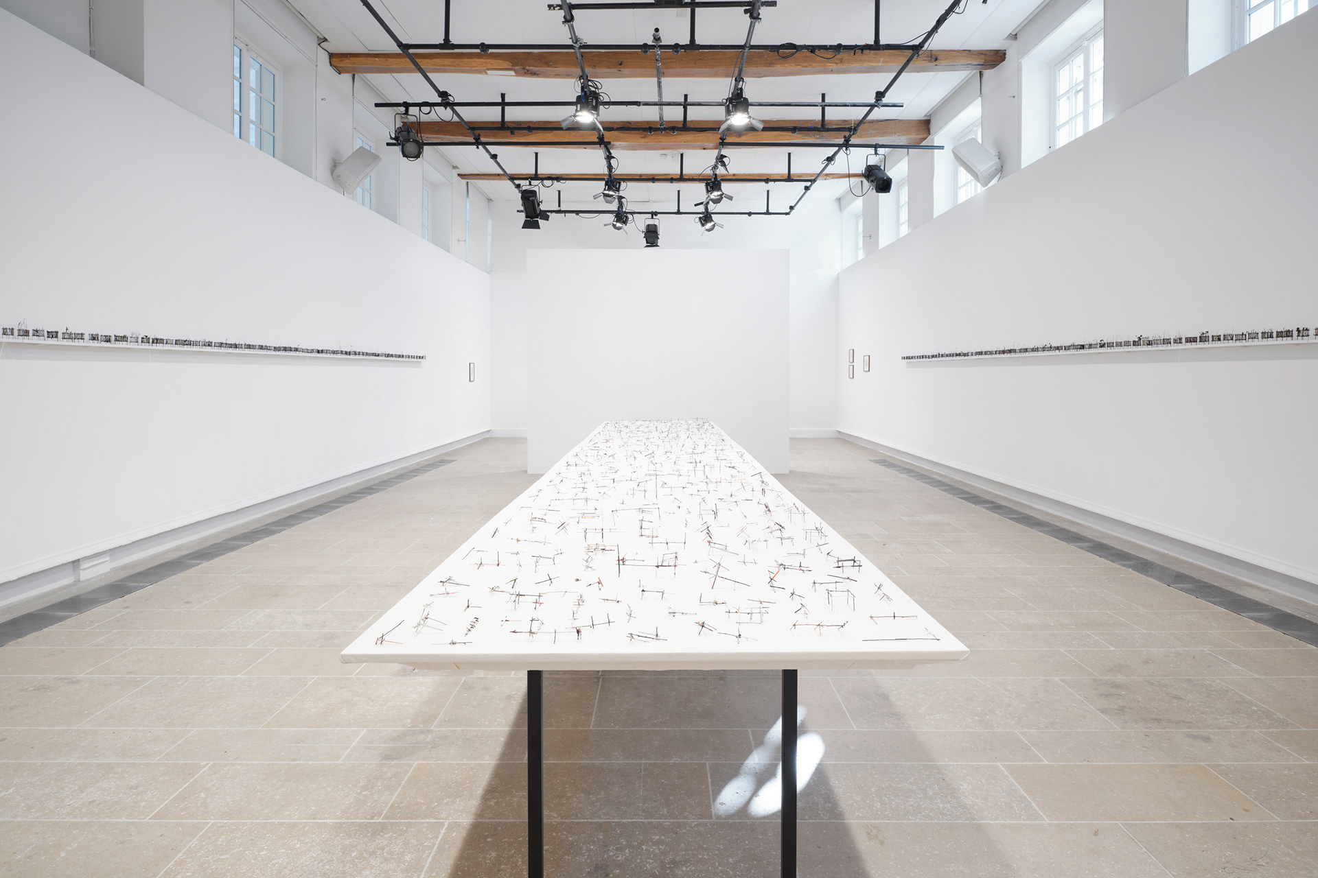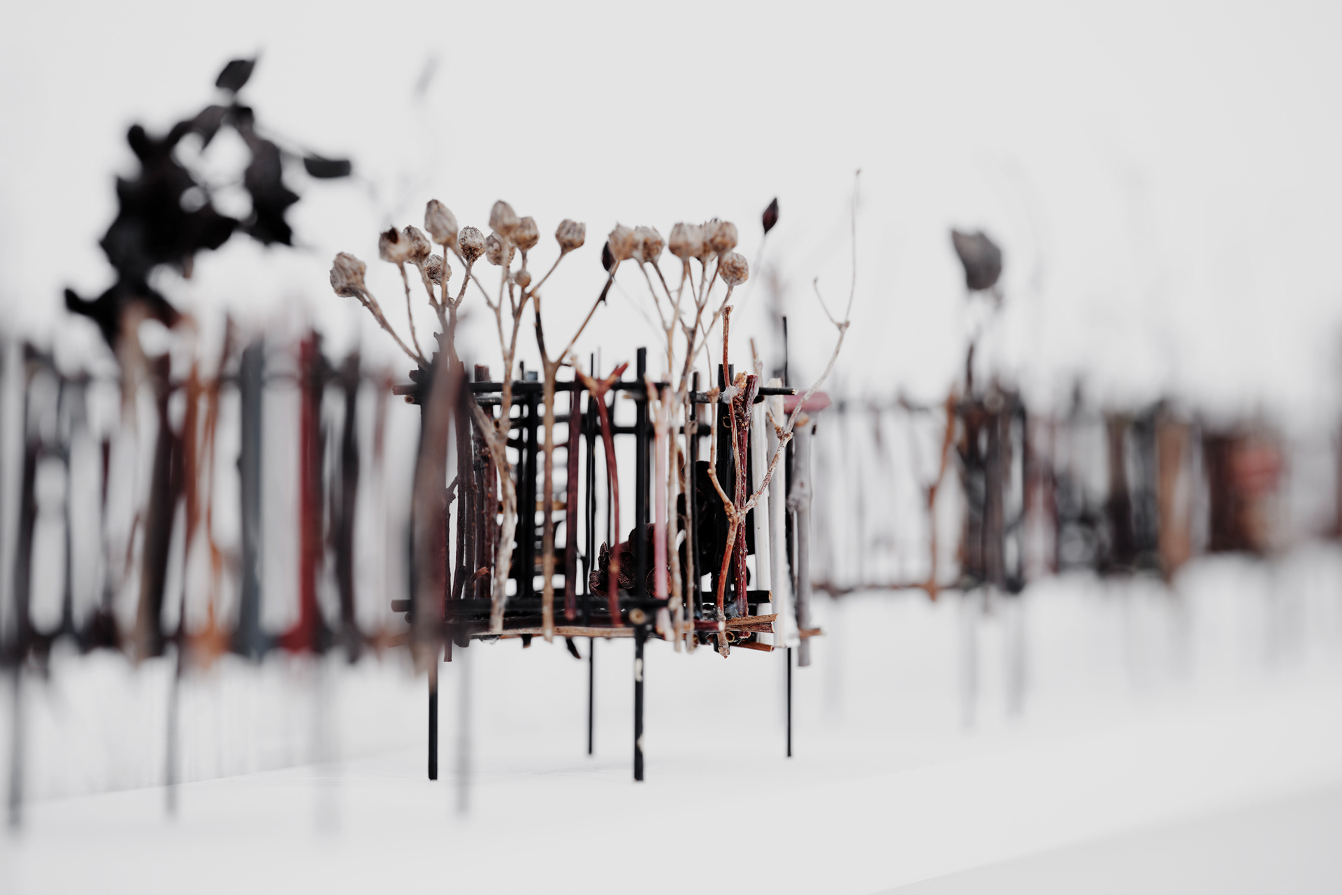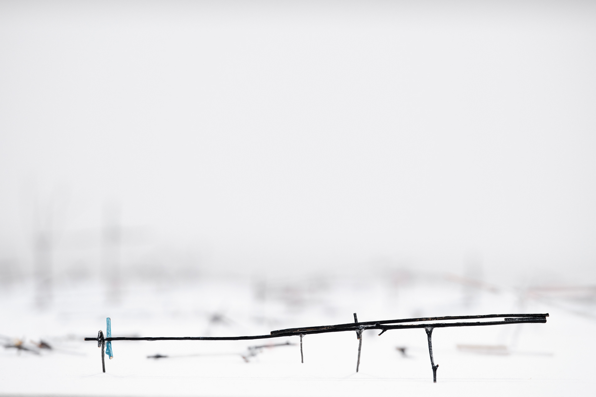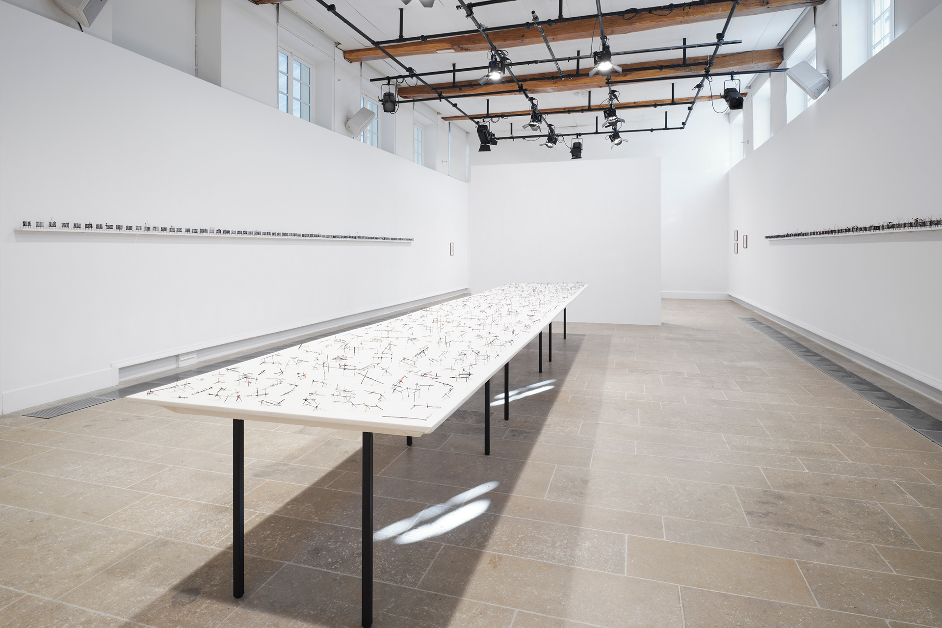 To the Edge of Your World asks what it means to be human today. The works in the installation painstakingly transform discarded materials such as twigs, twine, and cardboard into delicate sculptural metaphors for the interconnectedness of individual experience and world events. Broken and discarded bits of trees and twigs have been cut from their support system. In Groener’s work, Twine embodies an innate desire to physically, emotionally, and metaphorically repair and bridge distances. Repetition serves to revisit something already done or said relentlessly. Suffused by an audio environment of song combined with fragments of sounds from nature and everyday street life, the exhibition evokes patterns of displacement and the fragility of existence, as well as probing both the psychological effects of human tragedy and the resilience that may result. “It is a questioning of perception and a longing to get closer to an understanding of human conscience,” says the artist.